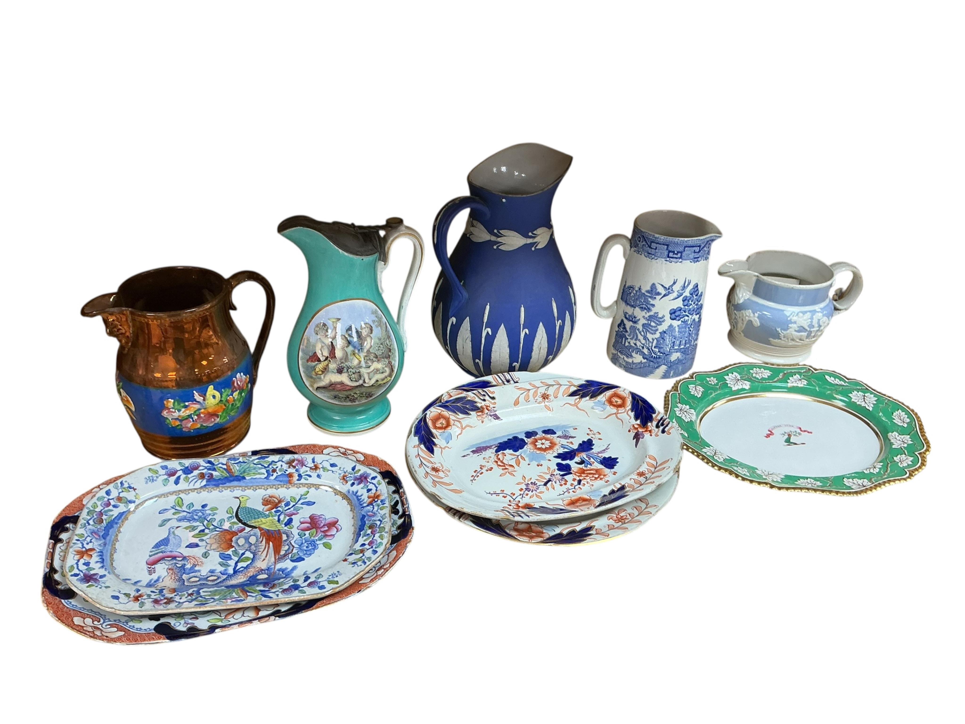 Four 19th century Ironstone dishes, a Derby porcelain armorial dish, copper lustre jug, Pratware jug and three others.
