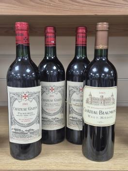 Four Bottles of Bordeaux red wine comprising three bottles of Château Gazin Pomerol, 1987, plus a Château Beaumont Haut-Medoc, 2005