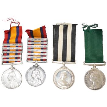 Four Victoria medals; a Queen’s South Africa medal awarded to 83840. Gnr. J. Lindsay. R.F.A., with clasps for Orange Free State, South Africa 1902, Cape Colony, and Transvaal,