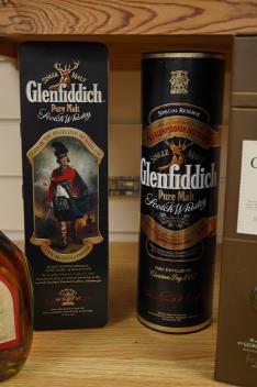 Lot 251 , Four bottles of Whisky to include The Glenlivet 12 years aged single malt and two bottles of Glenfiddich, together with a bottle of brandy