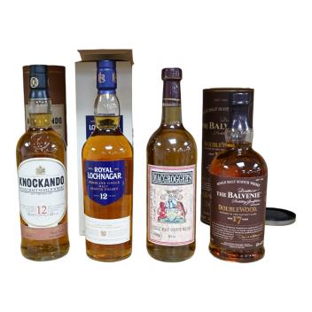 Lot 419 , Four various bottles of whisky to include The Balvenie Doublewood 17 year, Royal Lochnagar 12 year, Knockando 12 year and Macroggers. Condition - varies