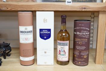 Four various bottles of whisky to include The Balvenie Doublewood 17 year, Royal Lochnagar 12 year, Knockando 12 year and Macroggers. Condition - varies