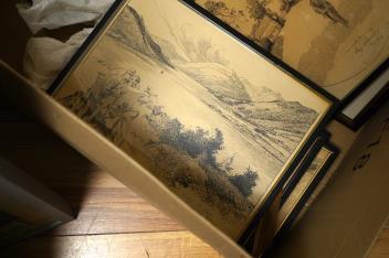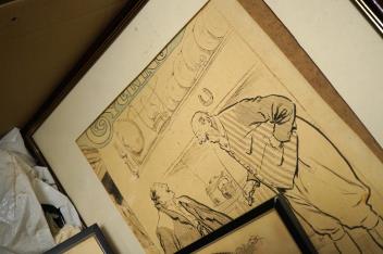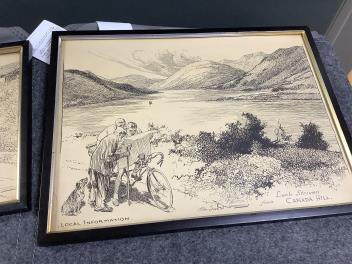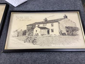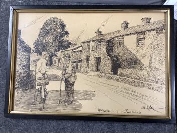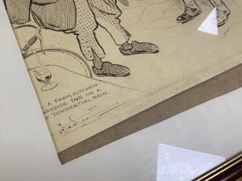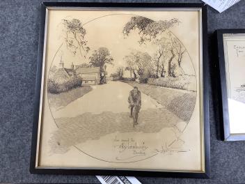 Largest (Cycling) with cream-discolouration; has slipped within frame. Road to Aylesbury with dark oval stain lower-left. All with varying degrees of discolouration. These are drawings/sketches, not prints.