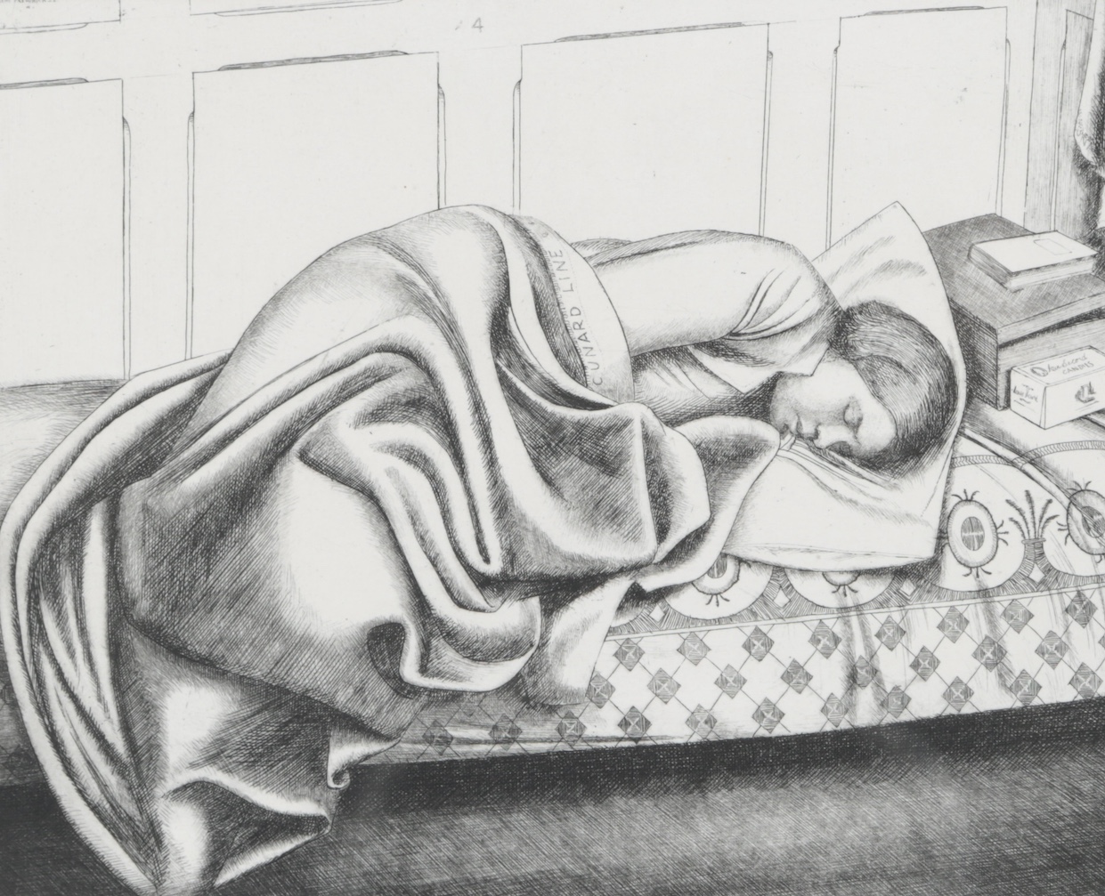 This etching was created on the return from the Austin’s honeymoon. The newly-wed Phyllis Austin (Kneafcy), a Canadian Opera singer, is shown sleeping in the cabin of the Cunard ship on which they sailed from Canada in 1932. A box of her favourite 'Laura Secord' Candies can be seen on the bedside table.