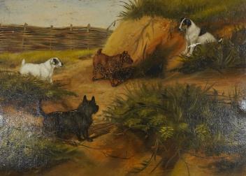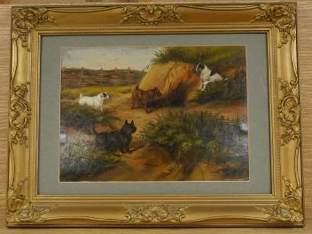 Lot 706 , Frederick French (fl. 1883-1916), terriers in a landscape, signed and dated 1888, oil on board, 20 x 28cm