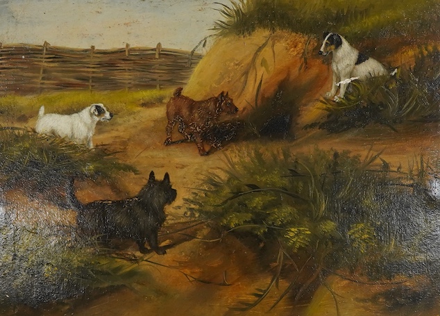 Frederick French (fl. 1883-1916), terriers in a landscape, signed and dated 1888, oil on board, 20 x 28cm