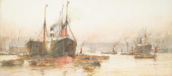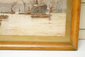 Lot 1789 , Frederick William Scarborough (1860-1939), Thames view with tug boats and ships, signed, watercolour, 23 x 52cm
