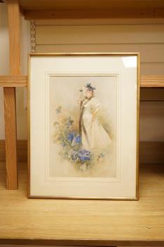Lot 774 , French School, 19th century, A study of an elegant woman and flowers, indistinctly signed lower right, watercolour, 38 x 25cm