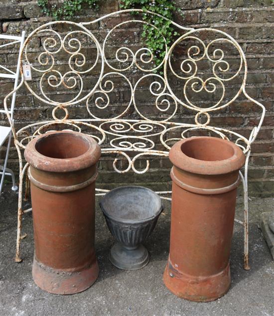 Garden bench, 2 chimney pots & lead urn