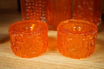Lot 3152 , Geoffrey Baxter (1922-1995) for Whitefriars, five pieces of tangerine glass comprising three vases and a pair of candlesticks, largest 20cm high.