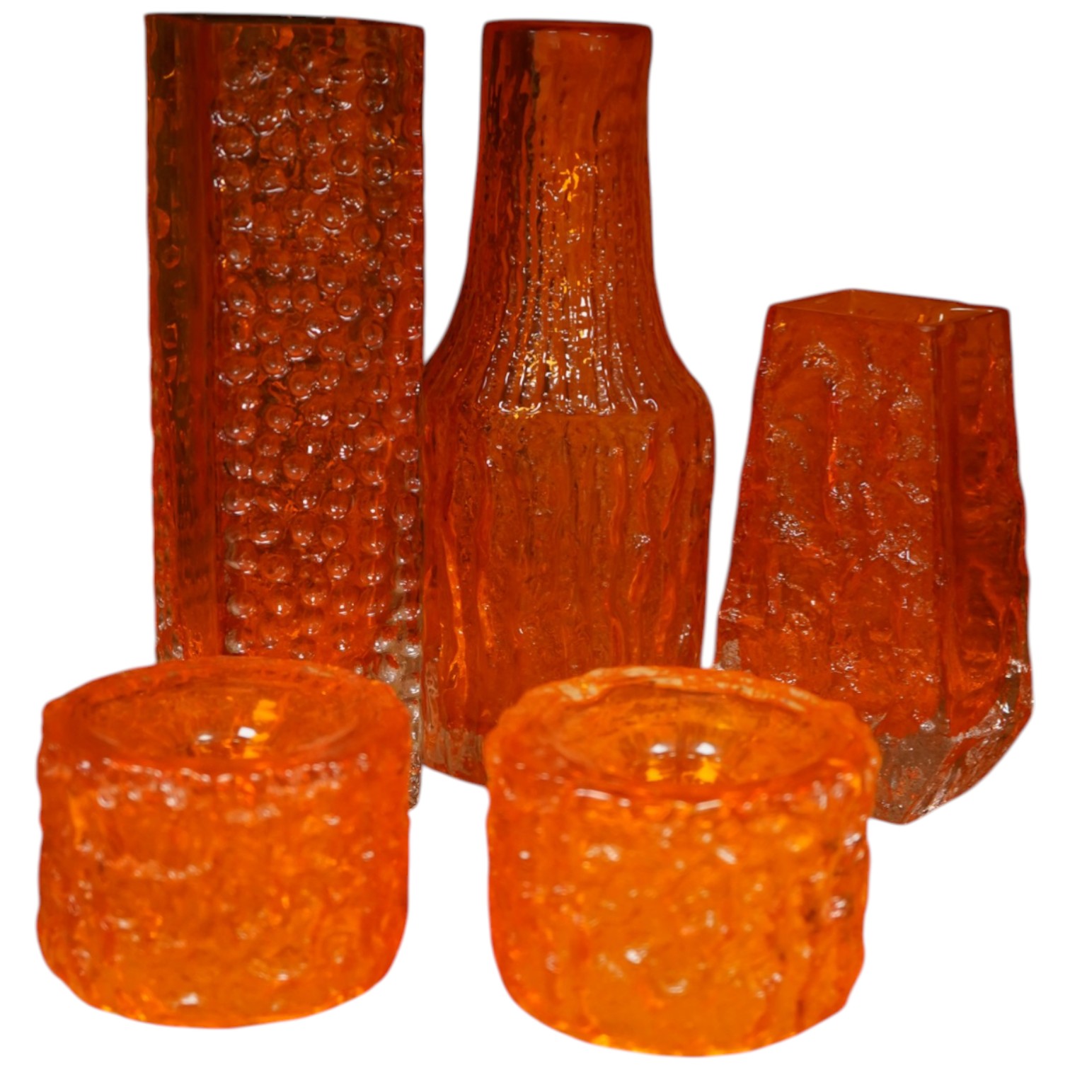 Geoffrey Baxter (1922-1995) for Whitefriars, five pieces of tangerine glass comprising three vases and a pair of candlesticks, largest 20cm high.