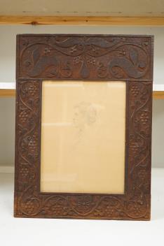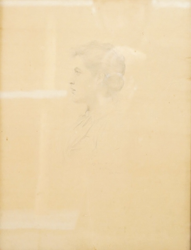 George Frederic Watts RA (1817-1904), portrait of a lady in profile, signed and dated 26th May 1889, pencil study, label and partial ink inscription verso, housed in an oak frame carved with flowers and grapevines, 39 x 29cm