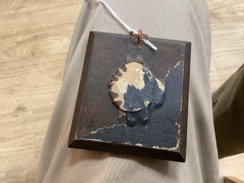 Some corrosion at his left shoulder and breast area, as shown, affecting both the image, the glass and the bezel. Otherwise good.
