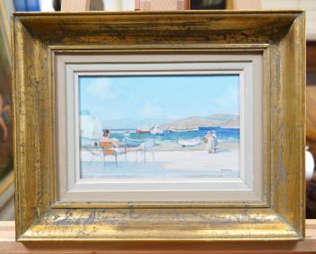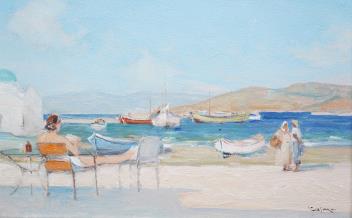 Lot 33 , Georgios Kosmadopoulos, Greek 1895-1967, A Greek coastal scene with a figure relaxing to the foreground