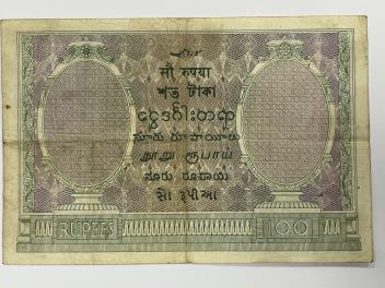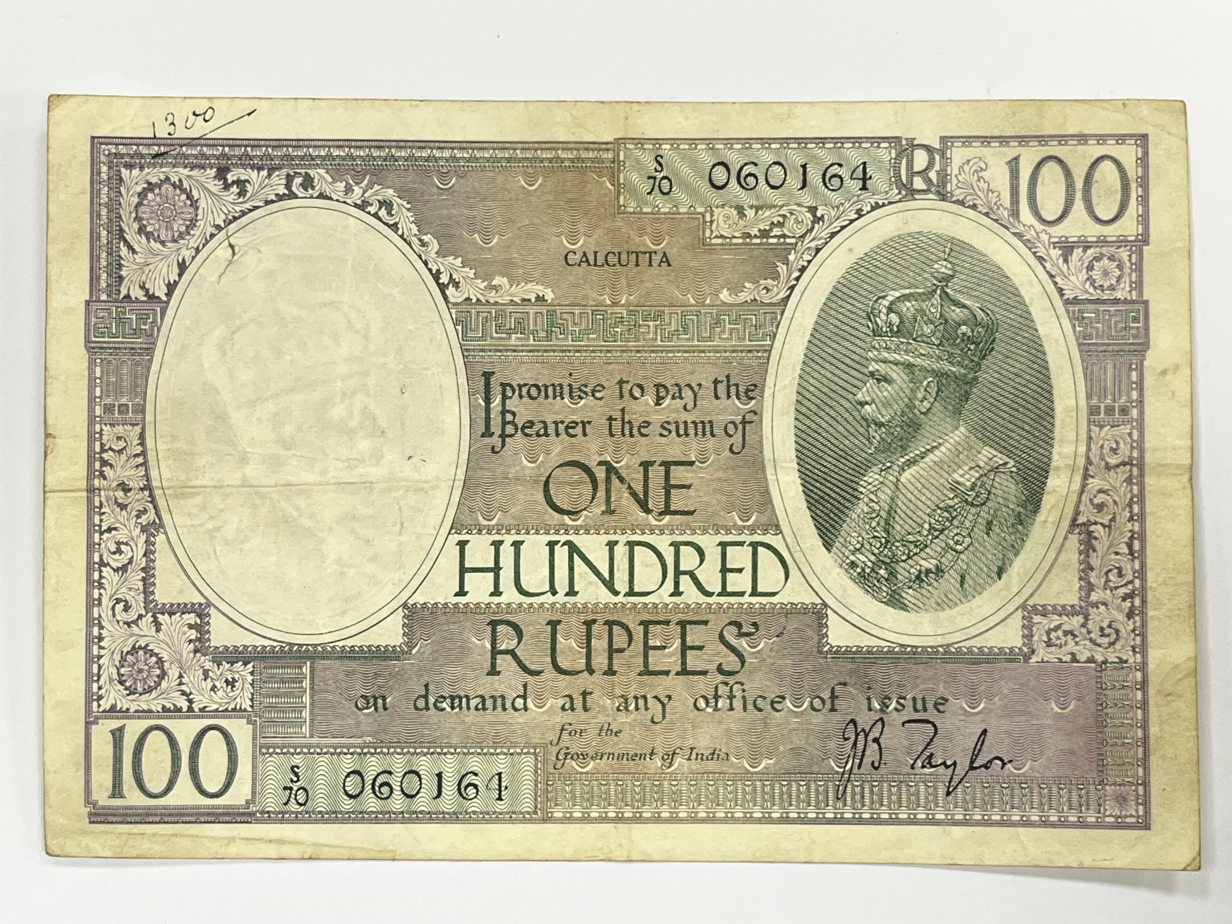 Lot 2067 , Government of India, 100 Rupees banknote, Calcutta, (1927), Taylor signature, serial number S/70 060164, folds and stains, spindle holes, inscribed in ink 1300 upper left, scarce in any grade