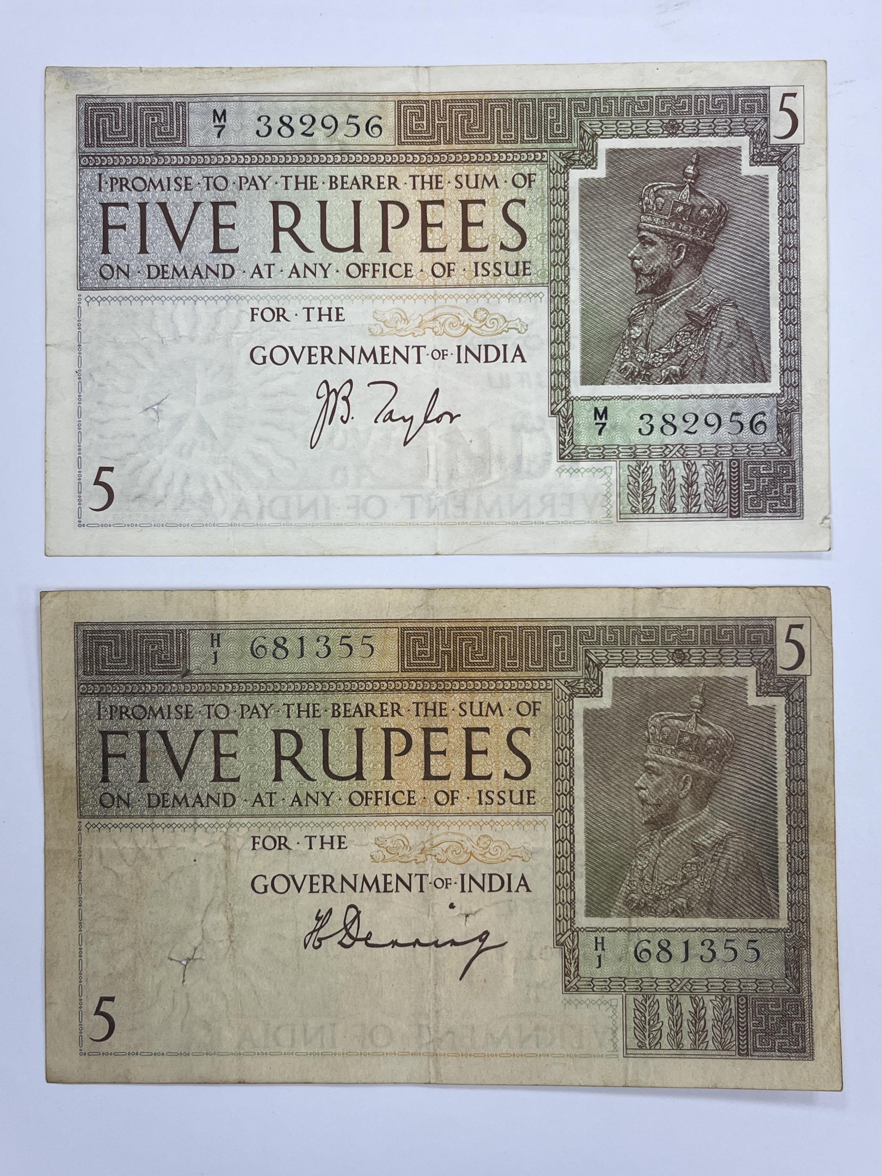 Lot 2063 , Government of India banknotes, 5 Rupees (1917-30), Taylor signature, serial number H/1 681355, enlarged spindle holes, folds, central pin hole, stains and, 5 Rupees (1917-30), Denning signature, serial number M/7 382956,