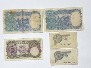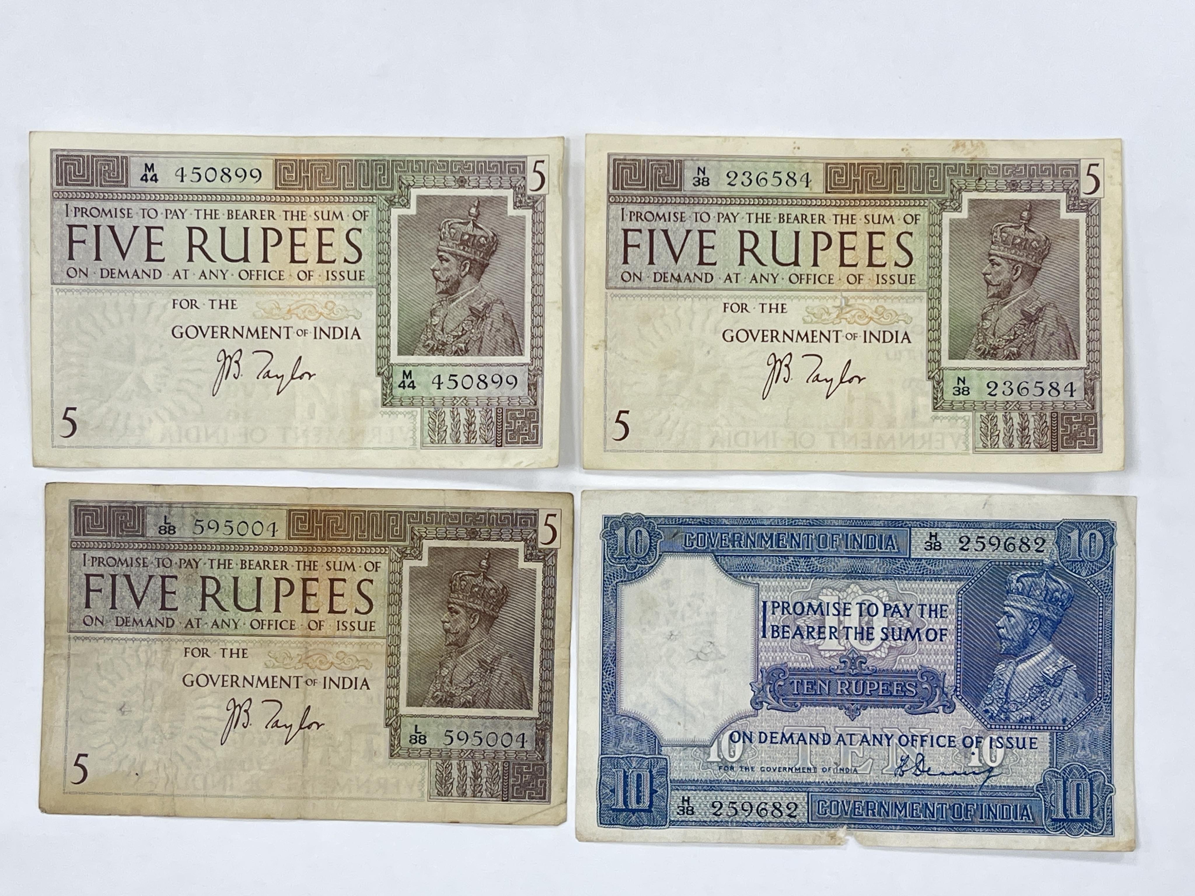Lot 2061 , Government of India banknotes, three 5 Rupees, (1917-30), Taylor signatures, red serial numbers M/44 450899, N/38 236584 and L/88 595004, pinholes, folds, stains, one with central hole, 10 Rupees, (1926), Denning signatu