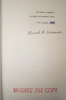 ° Graham, Kenneth. The Wind in the Willows. Illustrated by Ernest H Shepherd. limited edition (of 250 numbered copies, signed by the illustrator) colour pictorial title and half title, coloured illustrations throughout (including 13 full page) coloured pictorial endpapers,; gilt pictorial green morocco, blind pictorial panelled spine, gilt lettered direct, g. e. original slipcase with black illustrations & gilt lettering. Methuen Children's Books., 1971. * this copy out of series with Binder's File Copy stamped in red to foot of limitation page.