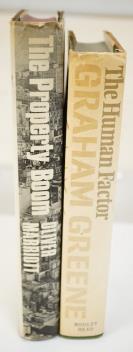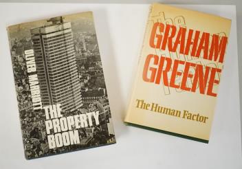 ° Greene, Graham - The Human Factor, 2nd printing, 8vo, publisher’s green cloth, spine lettered in gilt, with price clipped d/j, ink presentation inscription to front flyleaf, The Bodley Head, London, Sydney and Toronto, 1978 - The basis of the film of the same name (1979) directed by Otto Preminger, starring Nicol Williamson, Robert Morley, John Gielgud, Derek Jacobi, and Richard Attenborough. It was Preminger's last film, together with - Marriott, Oliver - The Property Boom, 2nd impression, 8vo, with unclipped d/j, Hamish Hamilton, London, 1967, (2)