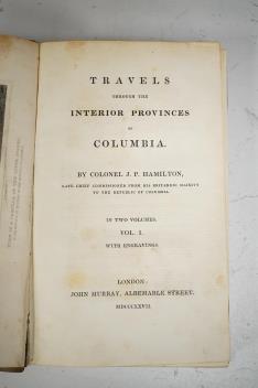 Lot 1289 , Hamilton, Col. J.P. - Travels through the Interior Provinces of Columbia. 1st edition, 2 vols. 7 plates and a folded map; contemp. half calf and marbled boards, gilt panelled spines with green and red labels, sm. cr.8vo.