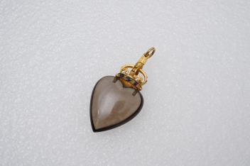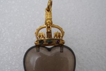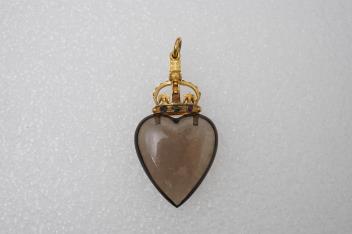 Hamilton and Inches, a smoky quartz and gem-set Luckenbooth pendant, Scotland, late 19th century, composed of a carved smoky quartz heart surmounted by a gold crown set with emeralds, rubies and seed pearls, length 6cm, one ruby deficient, fitted case stamped Hamilton & Inches