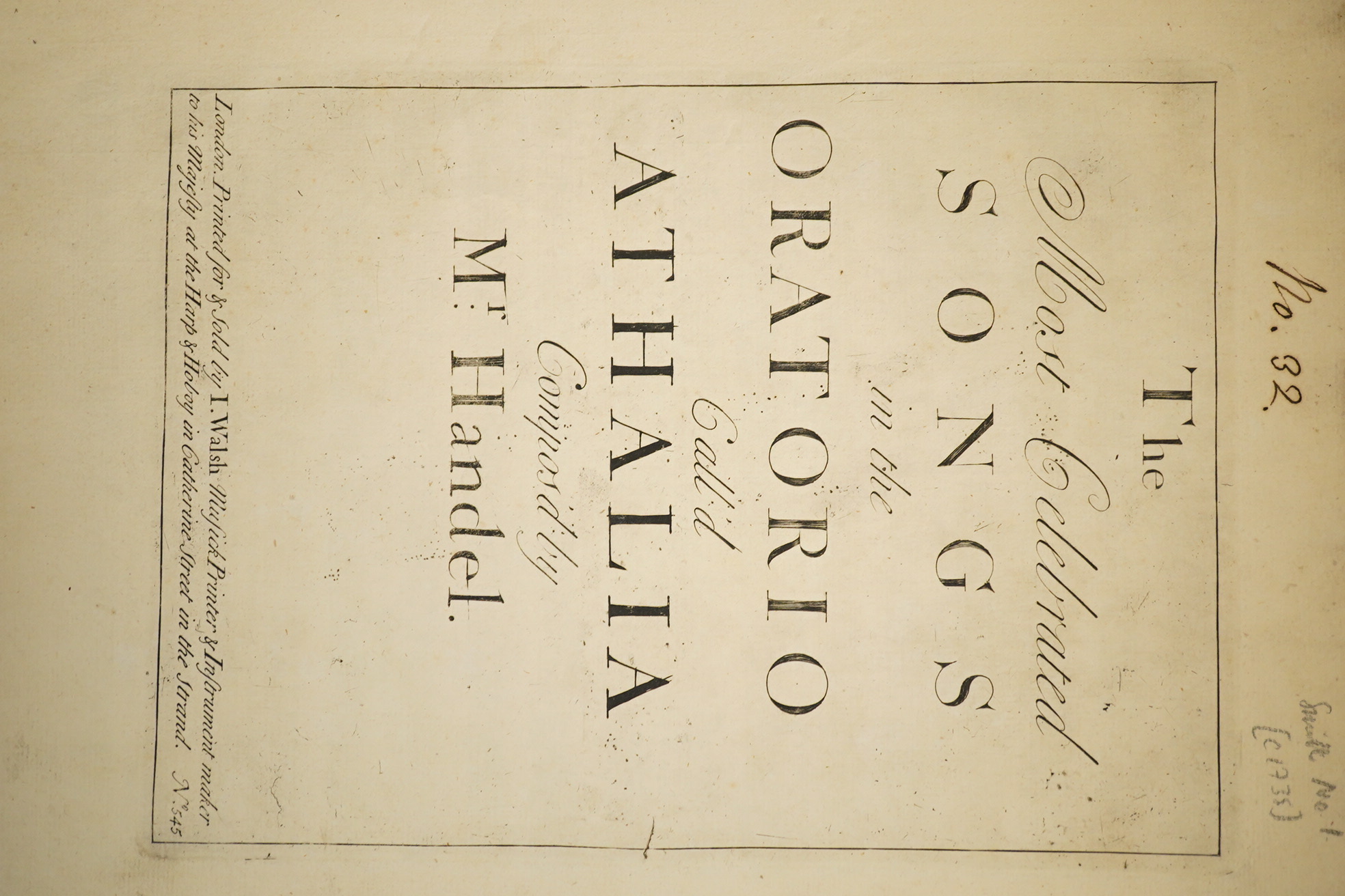 Handel, George Frederic - The most celebrated songs in the Oratorio call’d Athalia...No.545, 1st edition, folio, 19th century quarter calf with speckled boards, 29 pages, engraved throughout, first state of pagination, [