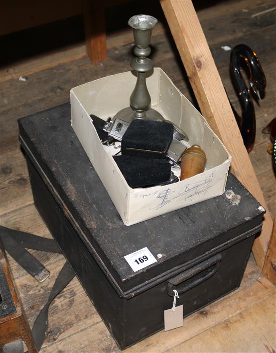 Lot 169 , Heeleys Original Patent corkscrew, The Pullezi, pewter candlestick, small copper measure, cocktail set, metal box, lighters(-) etc