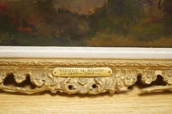 Lot 745 , Henry G. Moon (1857-1905), Landscape with autumnal trees, possibly Ashdown Forest, signed in ink to the stretcher verso, 39 x 48cm, applied plaque to the ornate gilt frame, oil on canvas board
