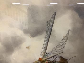 Three curious pale spots just above the sails, perhaps breaks in the clouds but may be old damp spots, see image 5; mount and frame good.