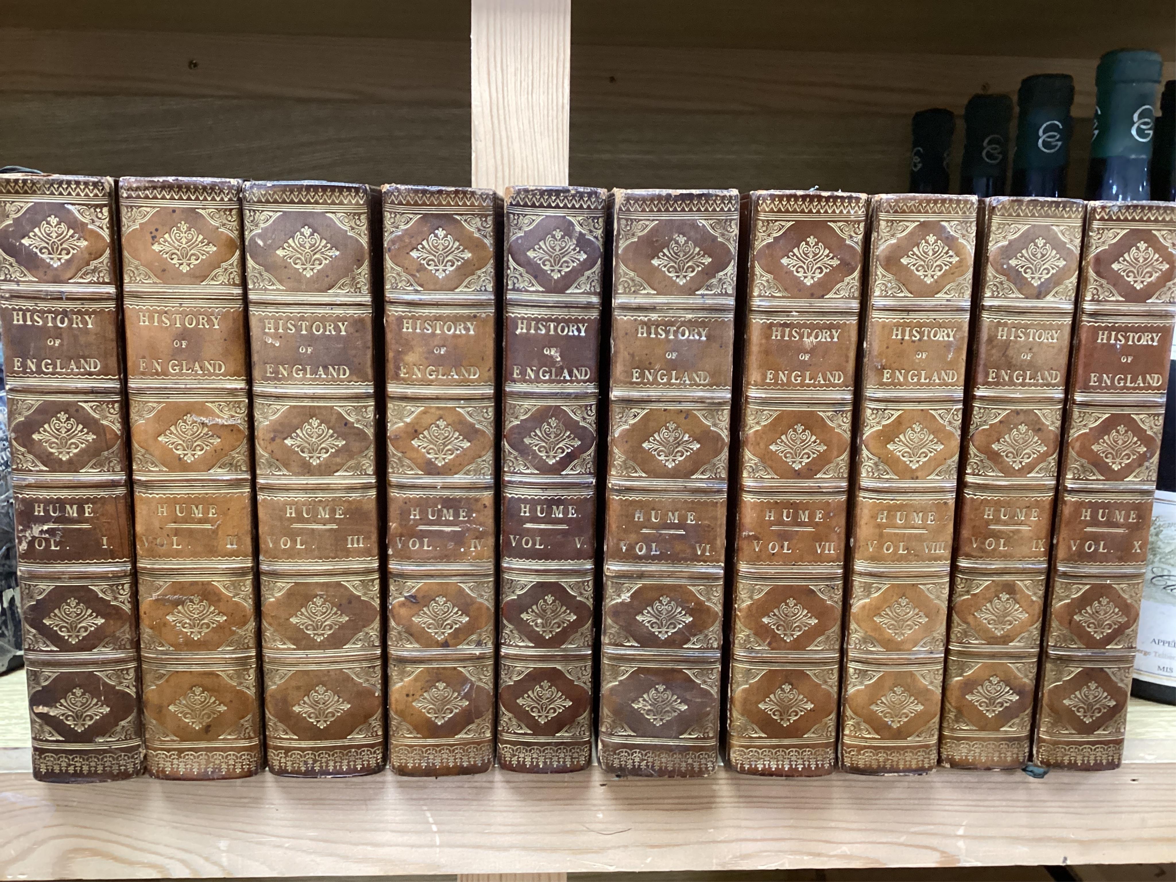 ° Hume, David. the History of England... to the Revolution in 1688. (New edition) 10 vols. num portraits and text engravings, folding coloured plan, contemp. blind and gilt ruled straight grain morocco, gilt decorated panelled spines, marbled edges and e/ps 1803