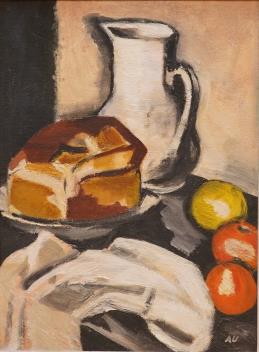 Impressionist, oil on board, Still life of fruit and vessels, initialled A.U, 59 x 42cm