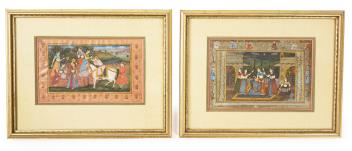 Lot 2 , Indo-Persian school , (19th century), Mughal court scenes, Two gouache miniature paintings, Inscribed picture 18cm x 26.5cm, the second including borders 16.5cm x 26.5 cm