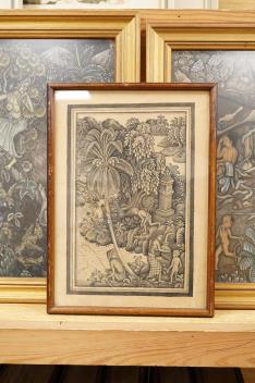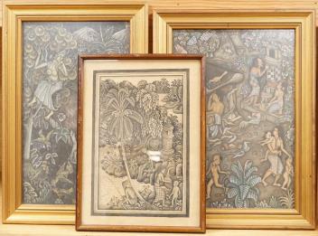 Lot 711 , Indonesian school, 20th century, village scenes, two watercolours, together with an en grisalle watercolour, largest 28 x 19cm (3)