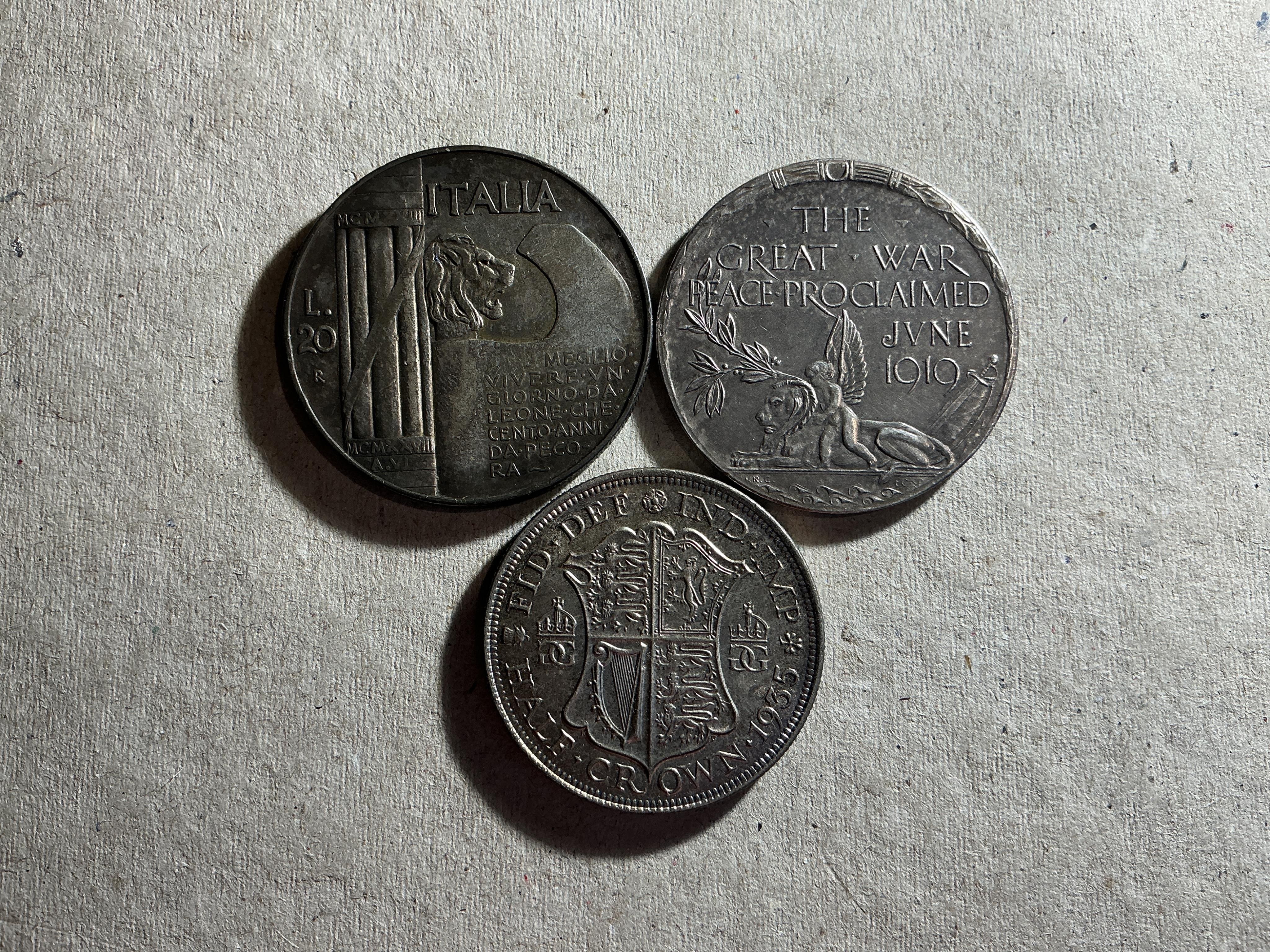 Lot 2032A, Italy, 20 Lira, 1928, KM 69, good VF, George V, halfcrown, 1935, EF, and a Great War Peace Proclaimed medal, 1919, good VF (3)