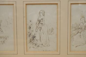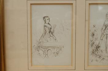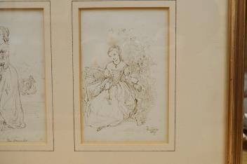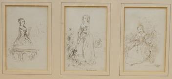 Lot 728 , J. Bouvier, Studies of fashionable ladies, to include one titled 'The bracelet', one signed and dated 1859, set of three pen and ink sketches, each mounted and framed as one, each 14 x 9cm