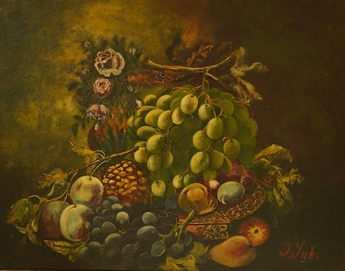 J. Juke, still life of fruit, signed, 20th century oil on board, 39 x 49cm