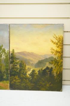 Lot 1705 , J. Moore, Two children on a hillside, signed and dated 1883, oil on canvas, together with a similar example, Riverscape with mountains beyond, pair of oils on canvas, unframed, each 50 x 40cm