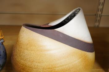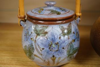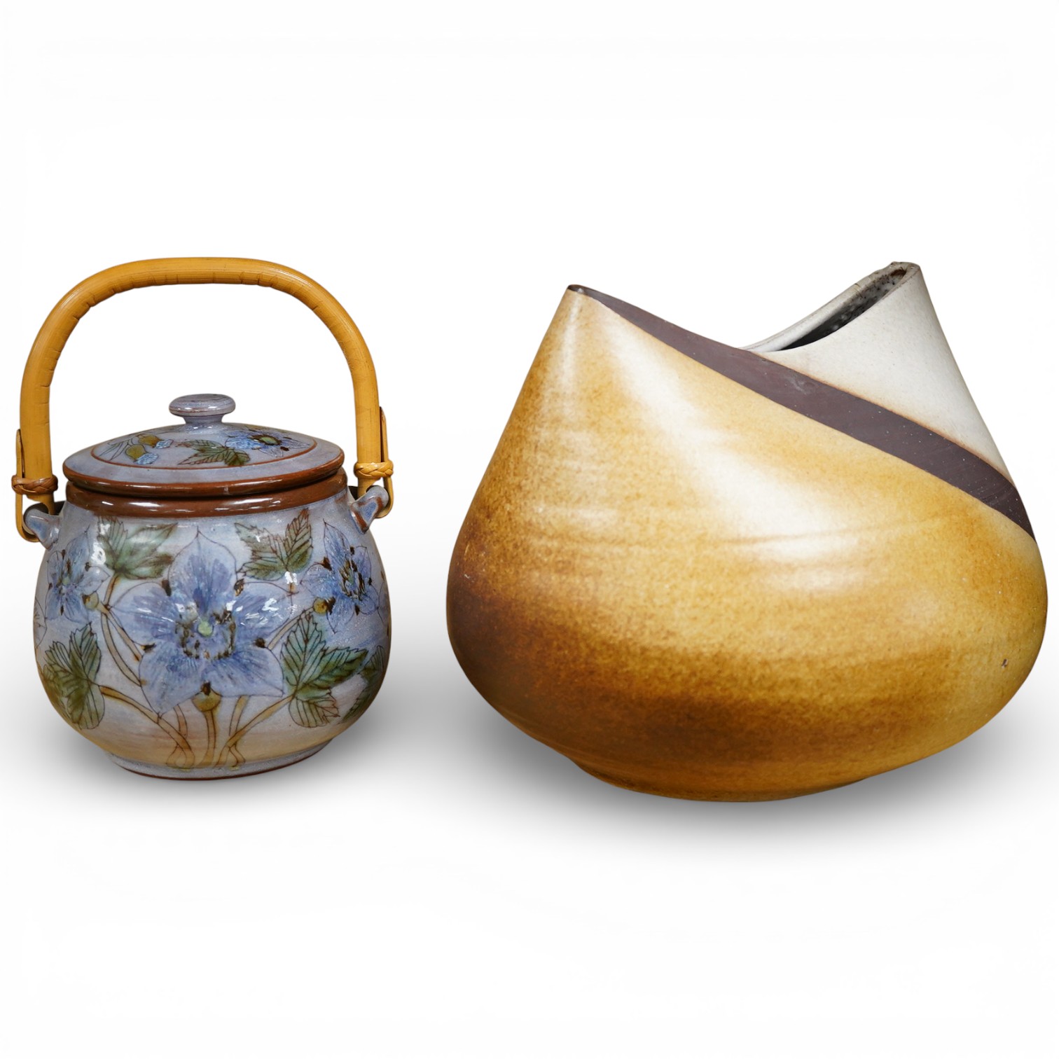 Lot 325 , J. Morgan for Chelsea pottery, a biscuit barrel decorated with flowers, and a studio pottery free form vase, hand coiled, signed to base, largest 22cm high