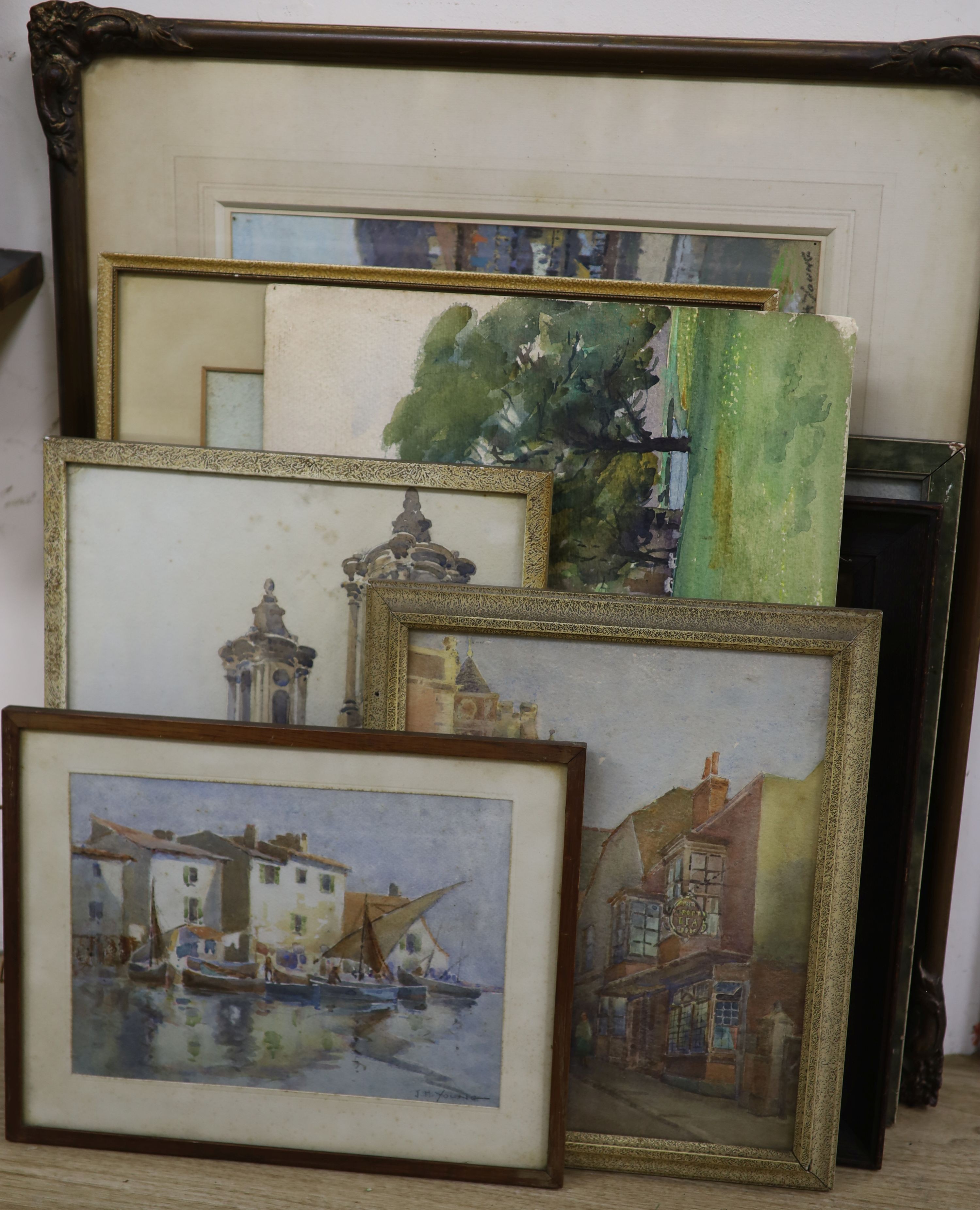 J.H. Young, pastel, View of an Italian town, signed, 34 x 39cm, together with seven other assorted works by the same hand