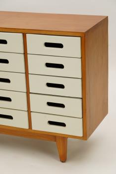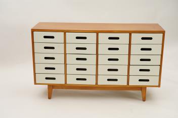 James Leonard (British, 20th century) for Esavian (E.S.A) Education Supply Association Ltd: A School (Scgool) bank of drawers, designed in the 1950s, teak and beech wood frame with twenty pull-out drawers, 120cm wide x 35cm deep x 71cm high