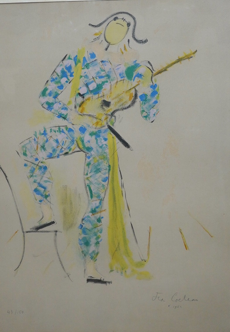 Lot 3318 , Jean Cocteau (French, 1889-1963), 'Arlequin a la guitar', signed in pencil and limited edition 43/150, lithograph in colours, 65 x 46cm