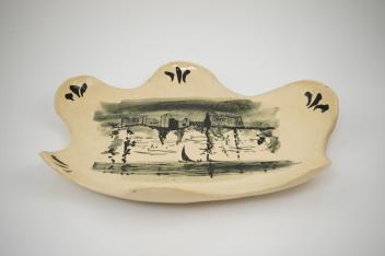 the interior of the shaped pottery dish painted with a view of the castle as viewed from the North bank of the River Wye, with a boat sailing by, against a mottled cream ground,