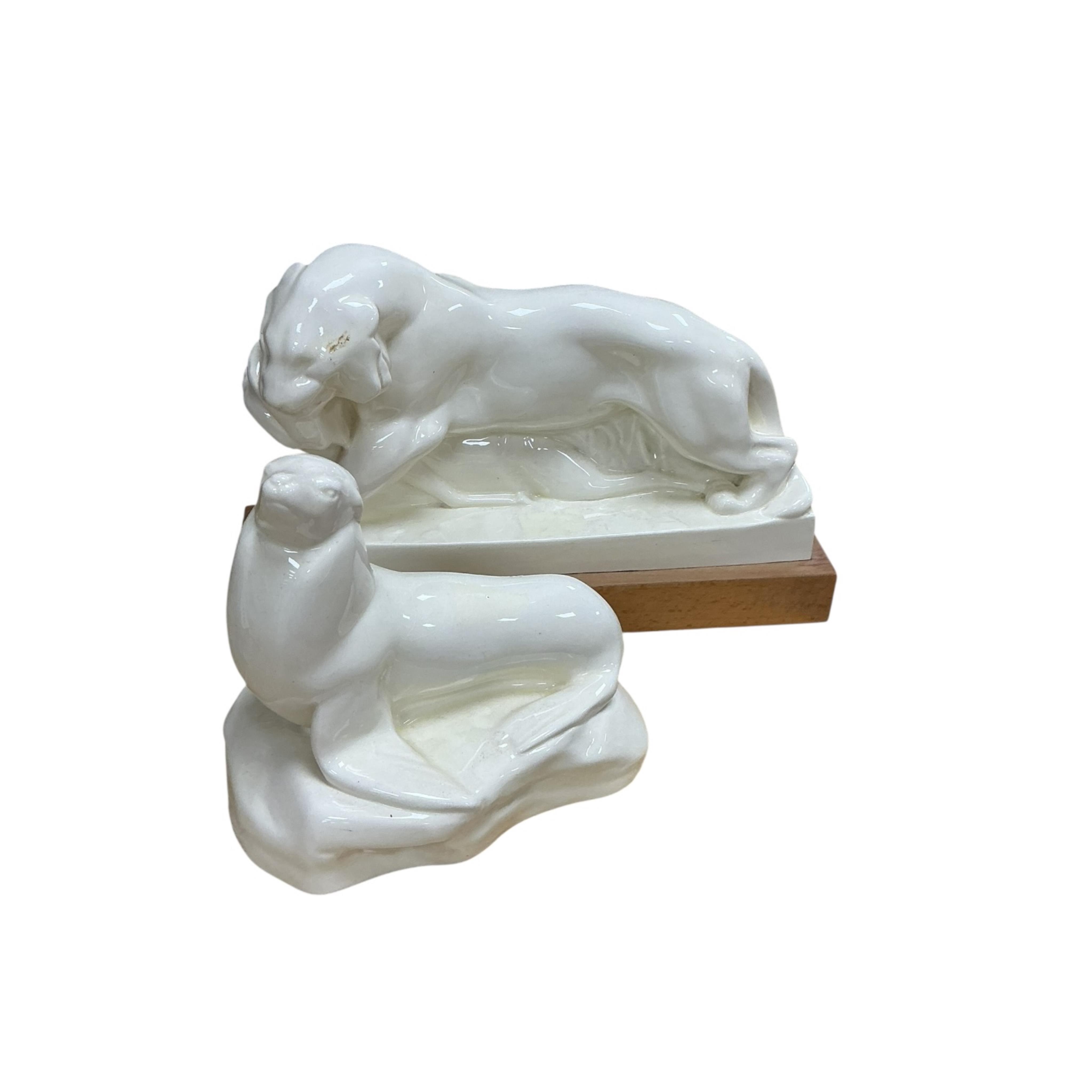 John Skeaping (1901-1980), for Wedgwood, an Art Deco figure of a tiger and prey, mounted on wood base together with a figure of a seal, largest 36cm wide