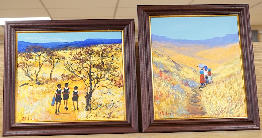 Katherine Ambrose (South African), African village scenes with figures, each signed, two oils on canvas, 39 x 34cm