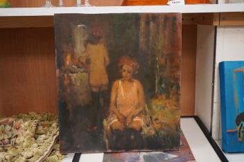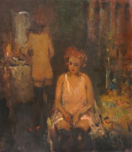 Lot 1755 , Ken Moroney (1949-2018), interior scene with two semi nude women, signed lower left, oil on board, unframed, 44 x 39cm