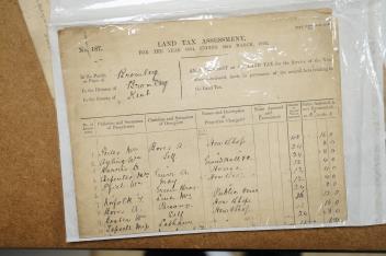 ° Kent 19th Century Taxation - Bromley Land Tax Assessment, 1895: 4pp. printed sheets, tall folio, headed and ruled in 8 columns, full ms. details infill, summary, approx. 74 occupiers names, signatures of assessors, local commissioner and clerk, with seals; Cudham Land Tax Assessment, 1852: (format as previous), printed with 5 columns, full ms. infill, signatures etc. as previous, includes collectors warrant, approx. 35 names; Cudham Land Tax Assessment, 1885: (format as previous), printed with 7 columns, full ms. infill, signatures etc. as previous, approx. 45 names; together with Land Tax printed sheets for St. Mary Cray (18 ) and Keston (1852) (5)