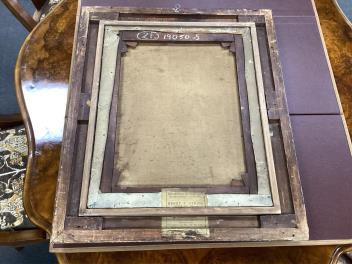 There is craquelure throughout and some small paint chips. The paint is flaking in some areas. Some retouching, the painting has not been relined. Some minor losses to the frame.