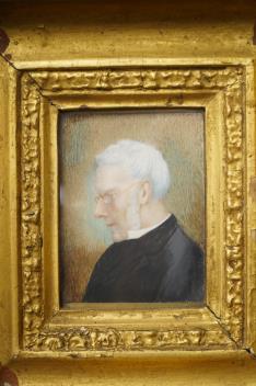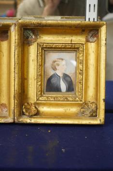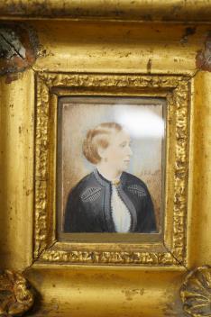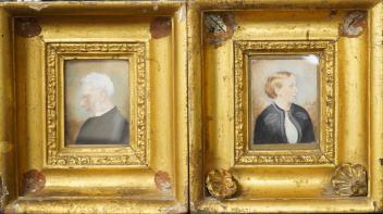 Lot 701 , Late 19th / early 20th century school, portrait miniatures of George Crampton and his wife, each with pencil inscriptions verso, one indistinctly signed and dated, pair of oils on ivory, gilt framed, 9 x 7cm CITES Submis