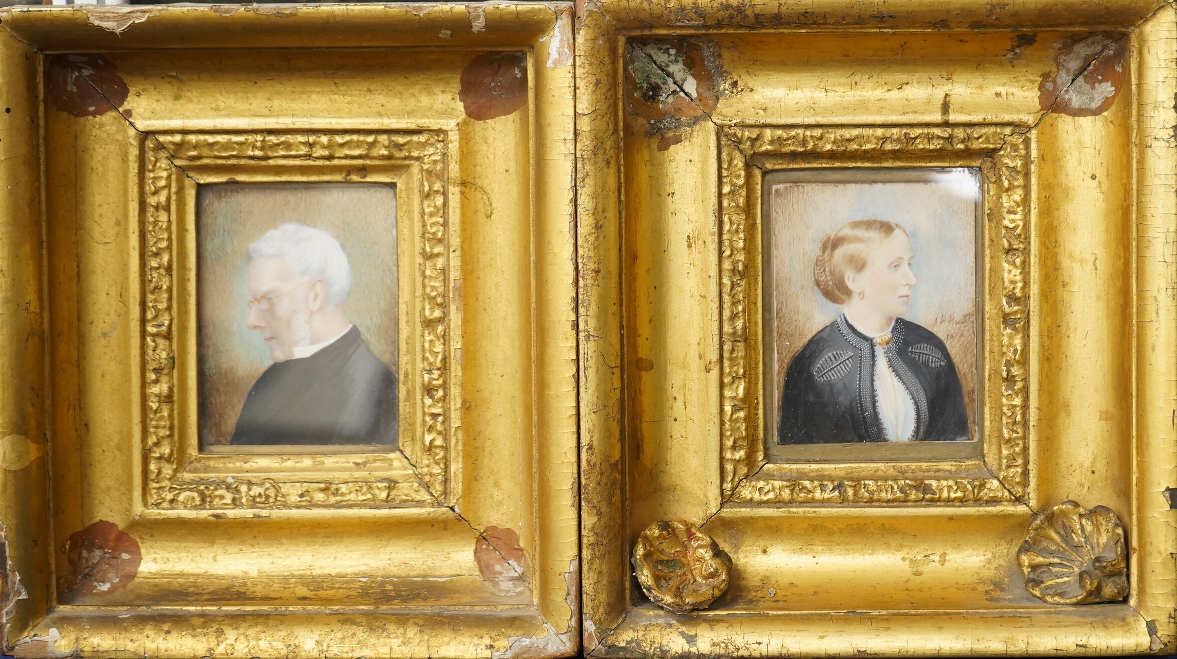Late 19th / early 20th century school, portrait miniatures of George Crampton and his wife, each with pencil inscriptions verso, one indistinctly signed and dated, pair of oils on ivory, gilt framed, 9 x 7cm CITES Submission reference