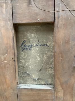 Canvas has moved upward in frame; unrestored, fair condition. Frame with chips, flakes and discolouration.
